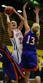 Junior forward Amber Hegge (Crofton, Neb.) led the Coyotes with her eighth double-double of the season with 17 points and 15 rebounds. Junior center Jodie Boss (Columbus, Neb.) added a double-double as well -- her fifth of the season -- with 10 points and 10 rebounds. Freshman post Stacia Robertson (Grand Island, Neb.) added 12 points while sophomore guard Alexis Yackley (Onida, S.D.) led with five assists.